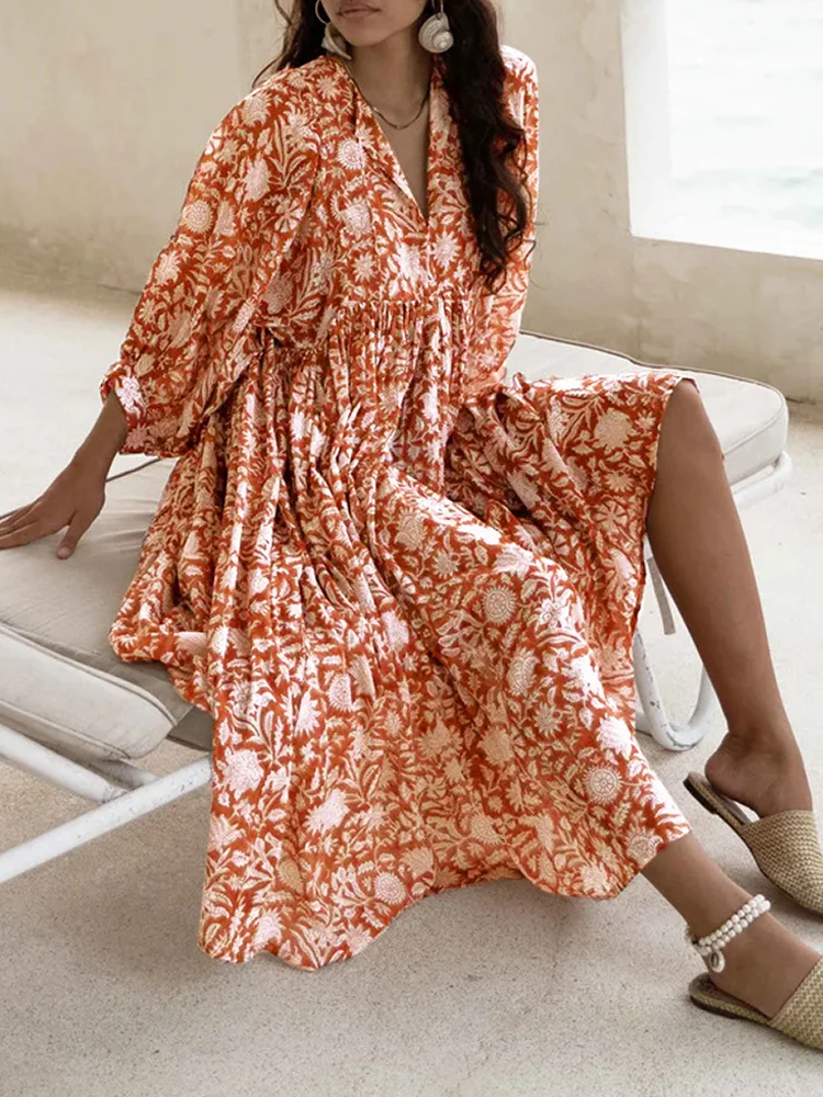 Boho Print V Neck 3/4 Sleeve Midi Dress