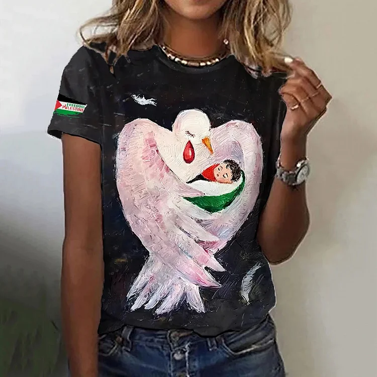 Dove Of Peace And Child Printed Crew Neck T-Shirt
