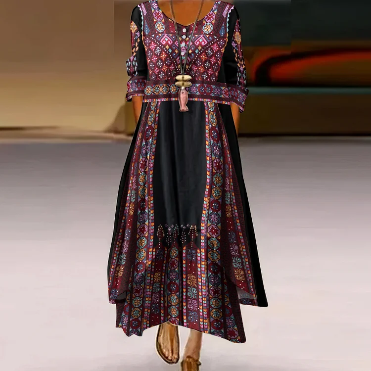 Ethnic Geometry Embroidery Palestinian Tatreez Flowy Maxi Long Dress