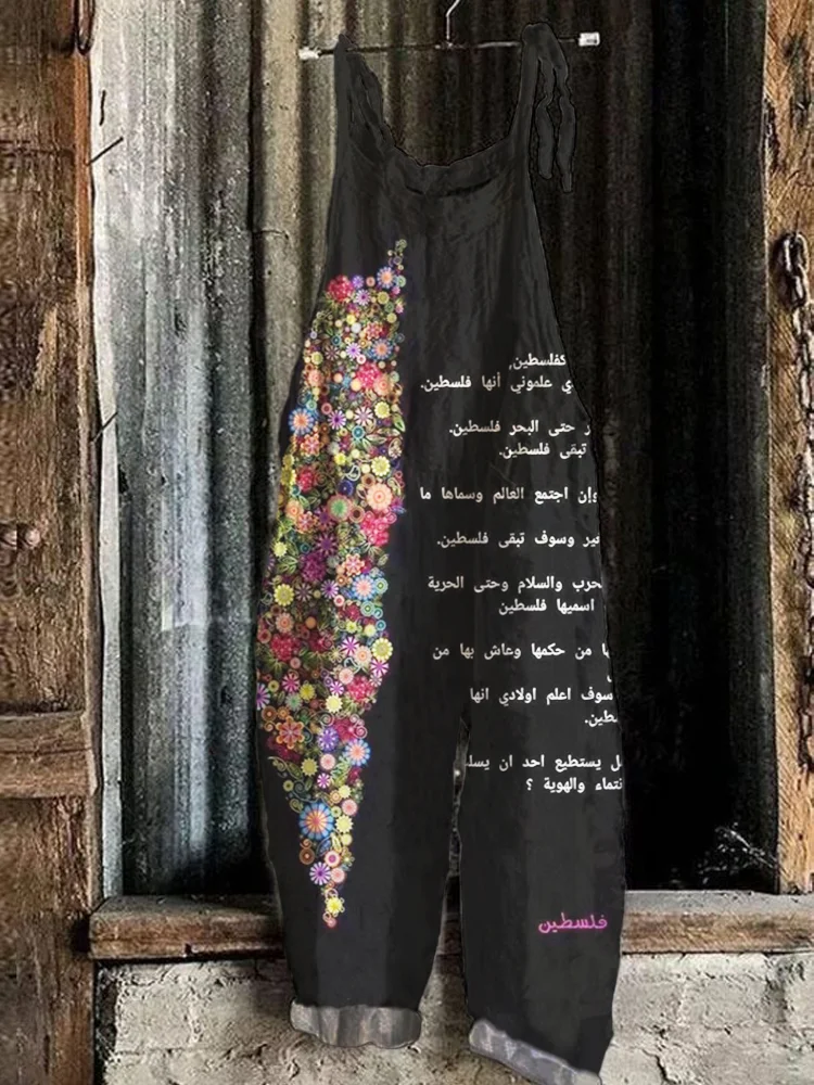 Flower & Palestine Manifesto Print Loose Casual Jumpsuit