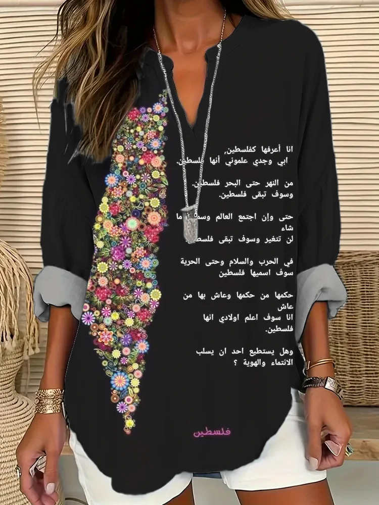 Flower & Palestine Manifesto Print Women's V-Neck Linen Long Sleeve Shirt