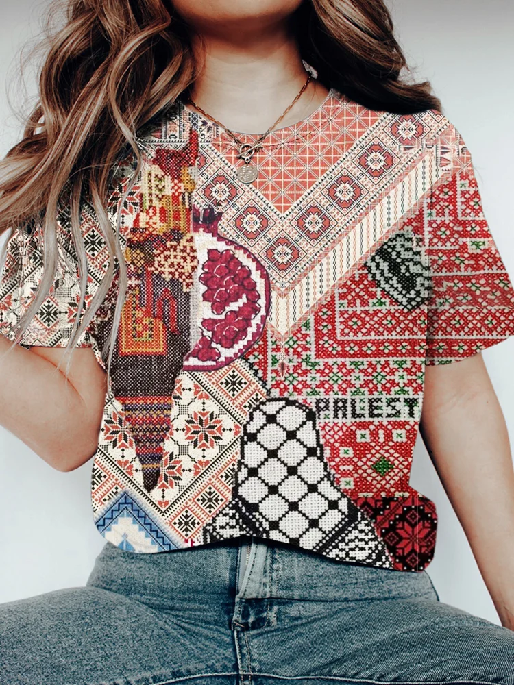 Free Palestinian Cross-Stitch Art Print Vintage Casual T-Shirt