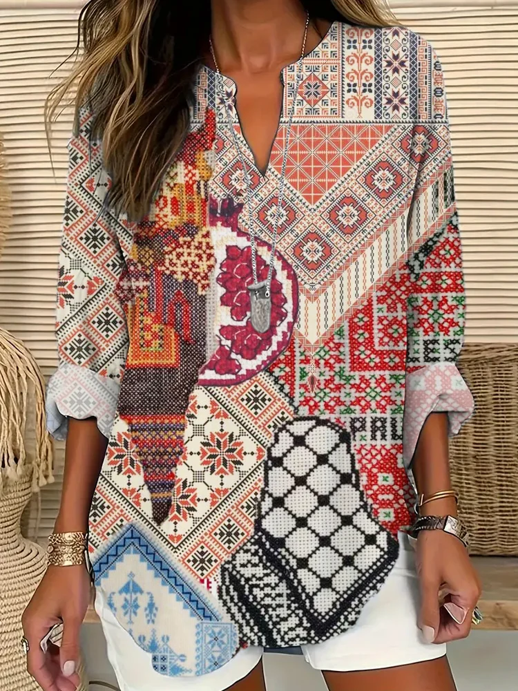 Free Palestinian Cross-Stitch Art Print Women's V-Neck Linen Long Sleeve Shirt