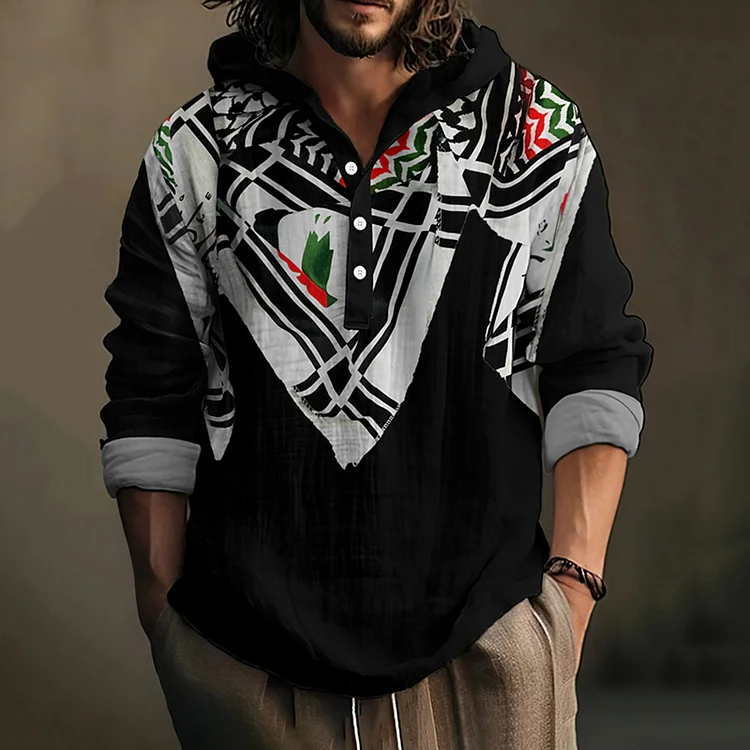 Men's We Hope Free Traditional Palestinian Keffiyeh Print Linen Hooded Shirt