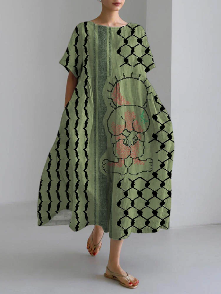 Palestinian Handalah Caricature In Realistic Tatreez Embroidery Linen Blend Maxi Dress