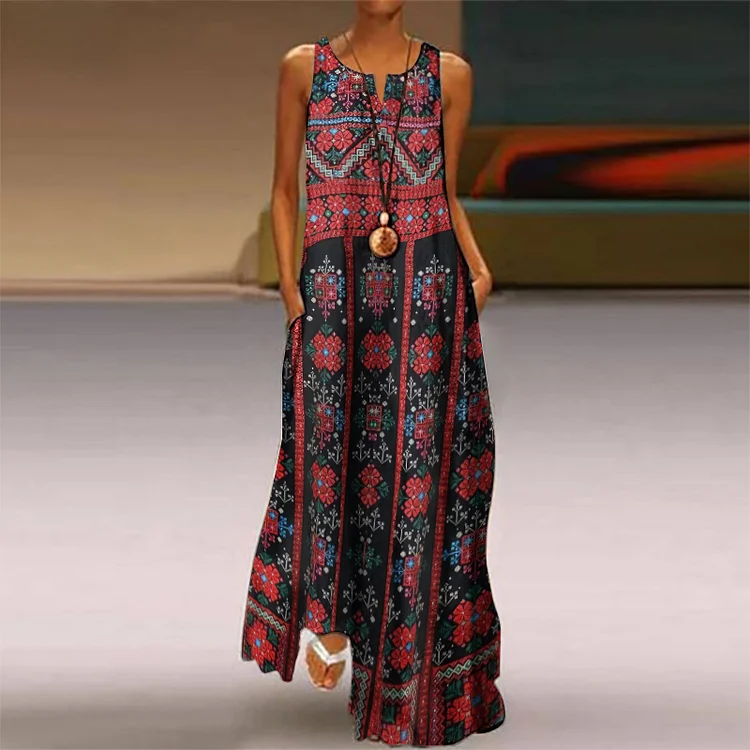 Palestinian Thobe Tatreez Art Inspired Pattern Flowy Maxi Dress