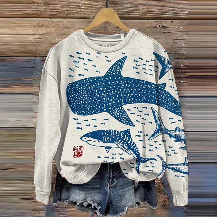 Sharks Sea Fish Japanese Lino Art Print Cozy Sweatshirt