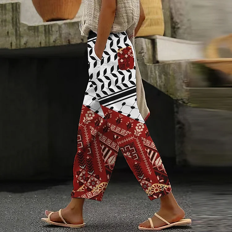 Women We Will Be Free Tribal Print Linen Blend Casual Pants