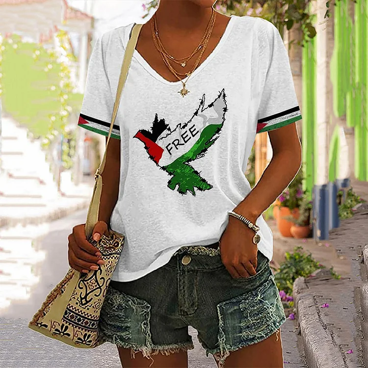 Women's Palestinian Freedom Print Casual V-Neck T-Shirt